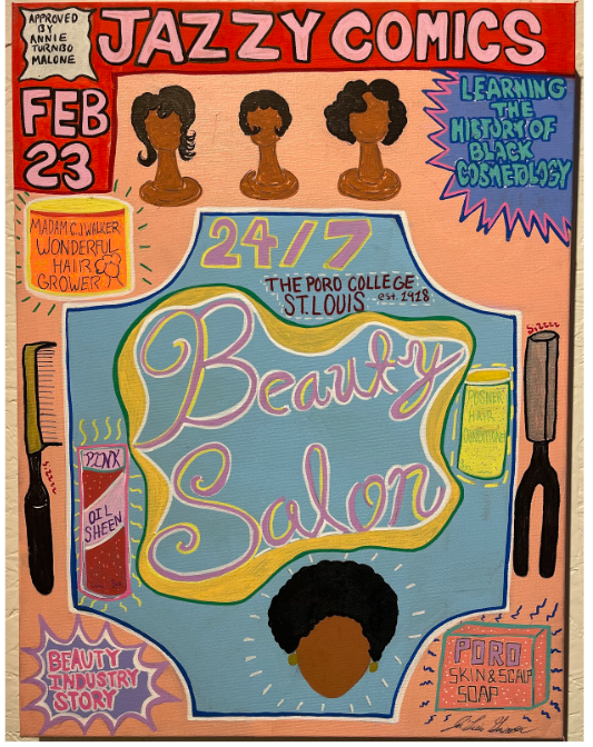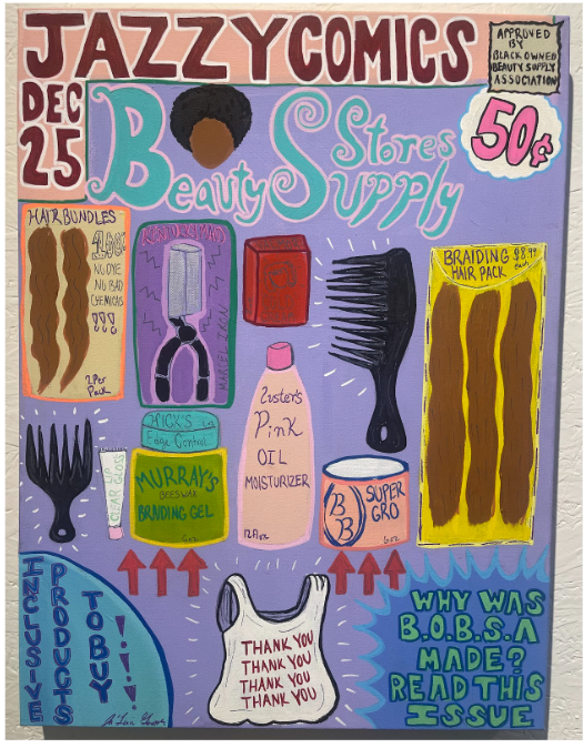 “Jazzy’s Comics” centers on documenting and celebrating Black material culture through a visual language inspired by comic book aesthetics. Using vibrant colors and graphic line work, I seek to transform everyday objects and spaces into vivid compositions that honor their cultural weight. These objects are archives that carry histories of care, resistance, entrepreneurship, style, and self-definition within Black communities. The comic book style I employ draws on a visual storytelling rhythm that is historically accessible and often heroic. “Jazzy’s Comics” functions as both homage and record. Through comic-inspired imagery, I aim to create a visual archive of lineage and lived experience from Black cultural touchstones that is as dynamic, layered, and resilient as the communities it reflects.